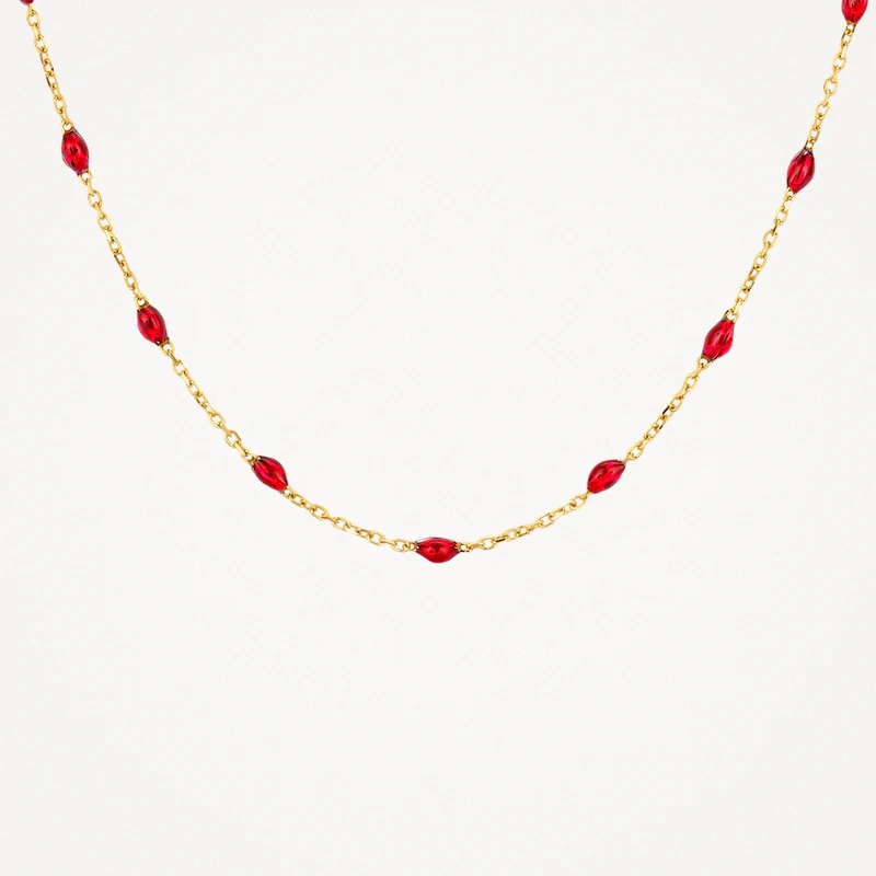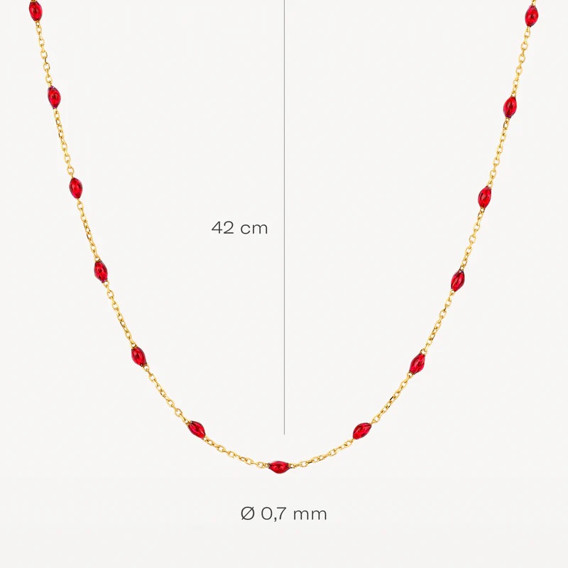 Red resin stones give this 14k yellow gold spring-clasp necklace a distinctive, warm touch.